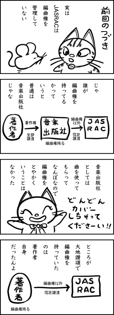 音楽出版社の仕事は管理している楽曲をたくさん使ってもらって著作権料を稼ぐことが仕事なので、カバー曲大歓迎の立場にあります。なので大地讃頌事件の前は、音楽出版社は編曲権を持っていたとしても権利行使することはありませんでした。